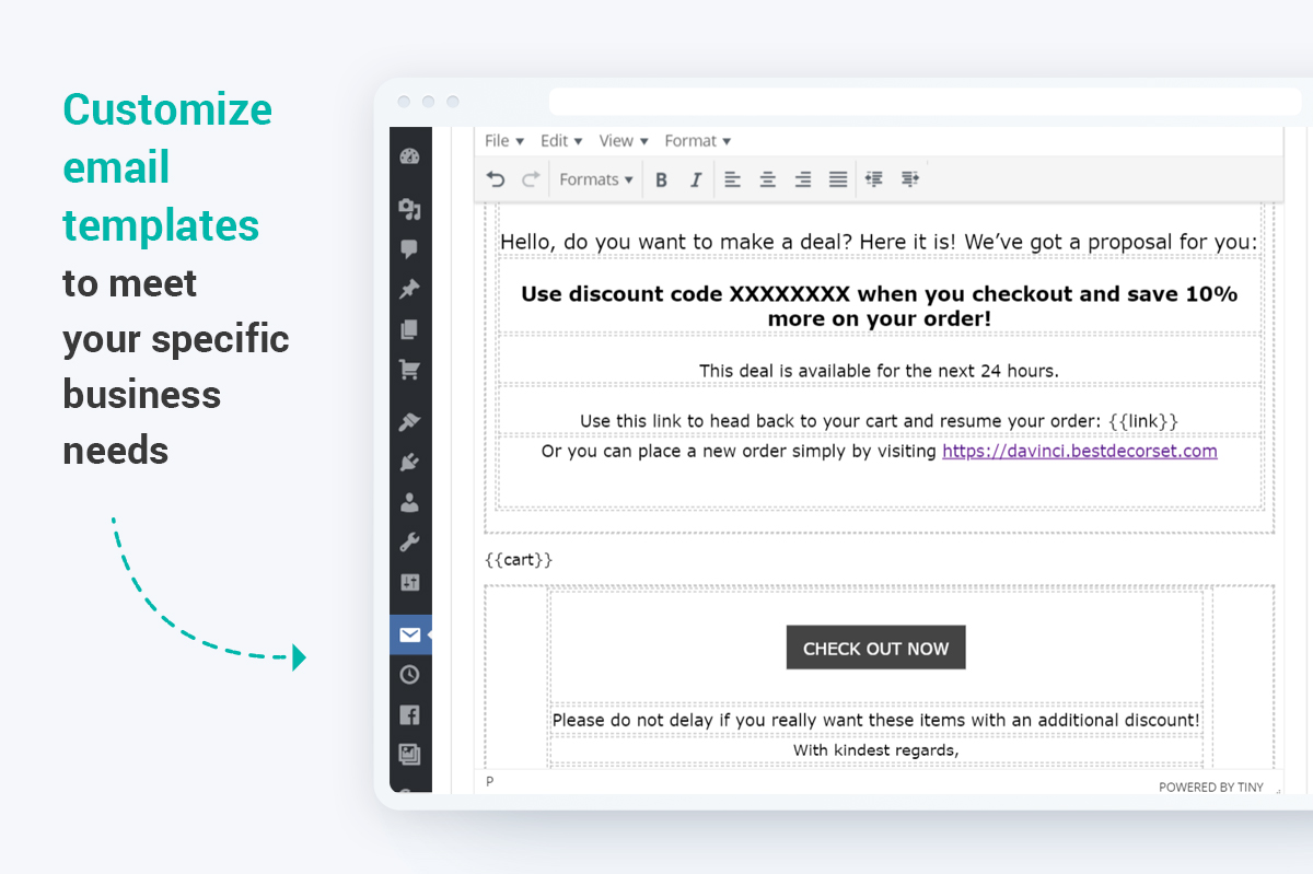 With the Abandoned Cart add-on, you can create a whole follow-up series to win back potential customers. Write a cadence of emails with addable promo offers and coupon codes – and watch the abandoned become unabandoned.