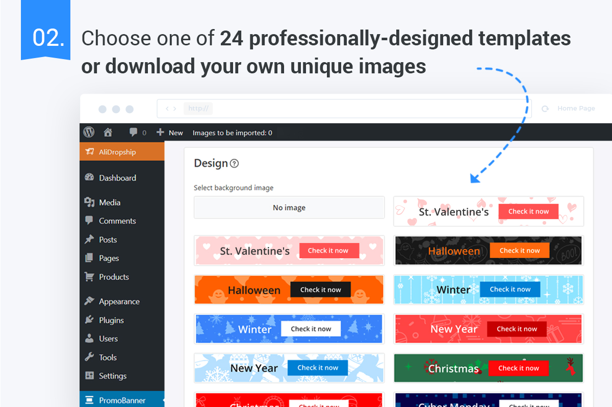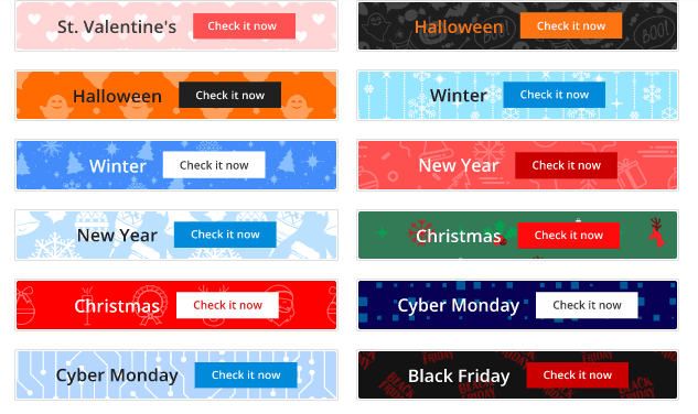 Leave the holiday work to us. Enjoy 24 ready-to-use holiday promotion banners designed by our team for quick, one-click solutions. These banners elicit a holiday mood and motivate shoppers to BUY.