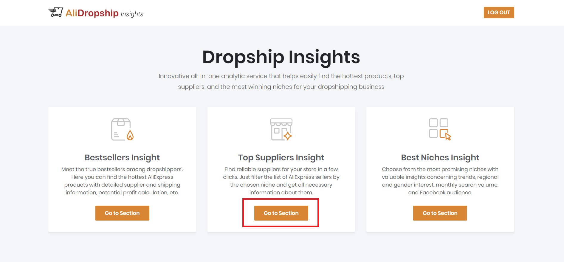 We have already found out that you can use AliDropship Insights to save your time and efforts when looking for reliable suppliers. So we go to Insights from AliDropship, sign in, and click ‘Top Suppliers Insight’.