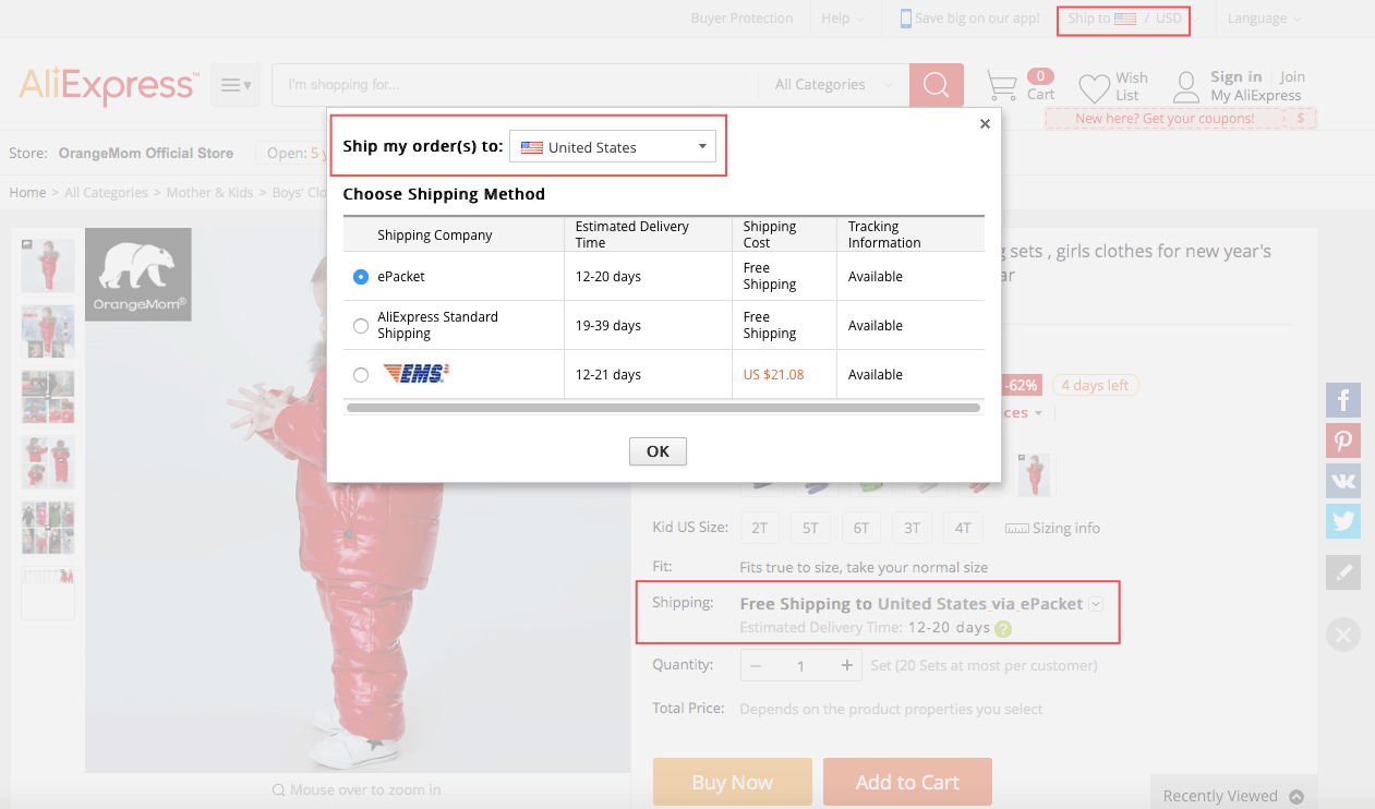 - In the top right corner of the screenshot, you can see the settings for the shipping destination and the national currency (in this case, it is the US and the US dollar.) It is really important to choose the necessary country of delivery and its currency before you start your research: every shipping service has varying fees that depend on the region of delivery. Plus, not every courier can arrange a shipping to any of the 195 countries on the globe!