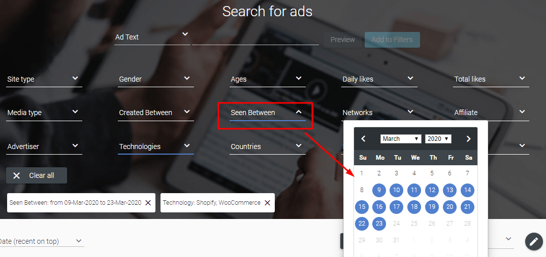 This filter can hide all ads that come from any platforms except the ones you choose. Here I picked Shopify and WooCommerce, so I’m going to see only ads created by ecommerce stores built on these platforms.