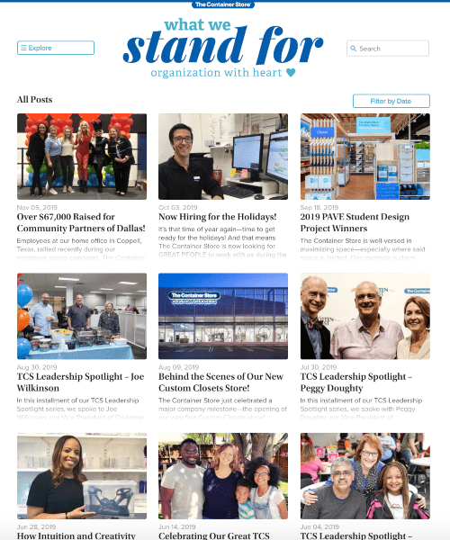 The U.S.-based home-storage solutions chain store features a blog on its website called the What We Stand For Blog. The page features many posts on community and corporate efforts, as well as those on storage ideas and home organization tips. The blog also features some employee highlights and how they get cleaned up at home. The Container Store’s blog showcases a great way to shine the light on your involvement efforts in your niche (taking part in eco-friendliness events, design scholarship contests) and showing corporate culture (hiring events, employee spotlights), all the while weaving in highlights about your products (organization tips).