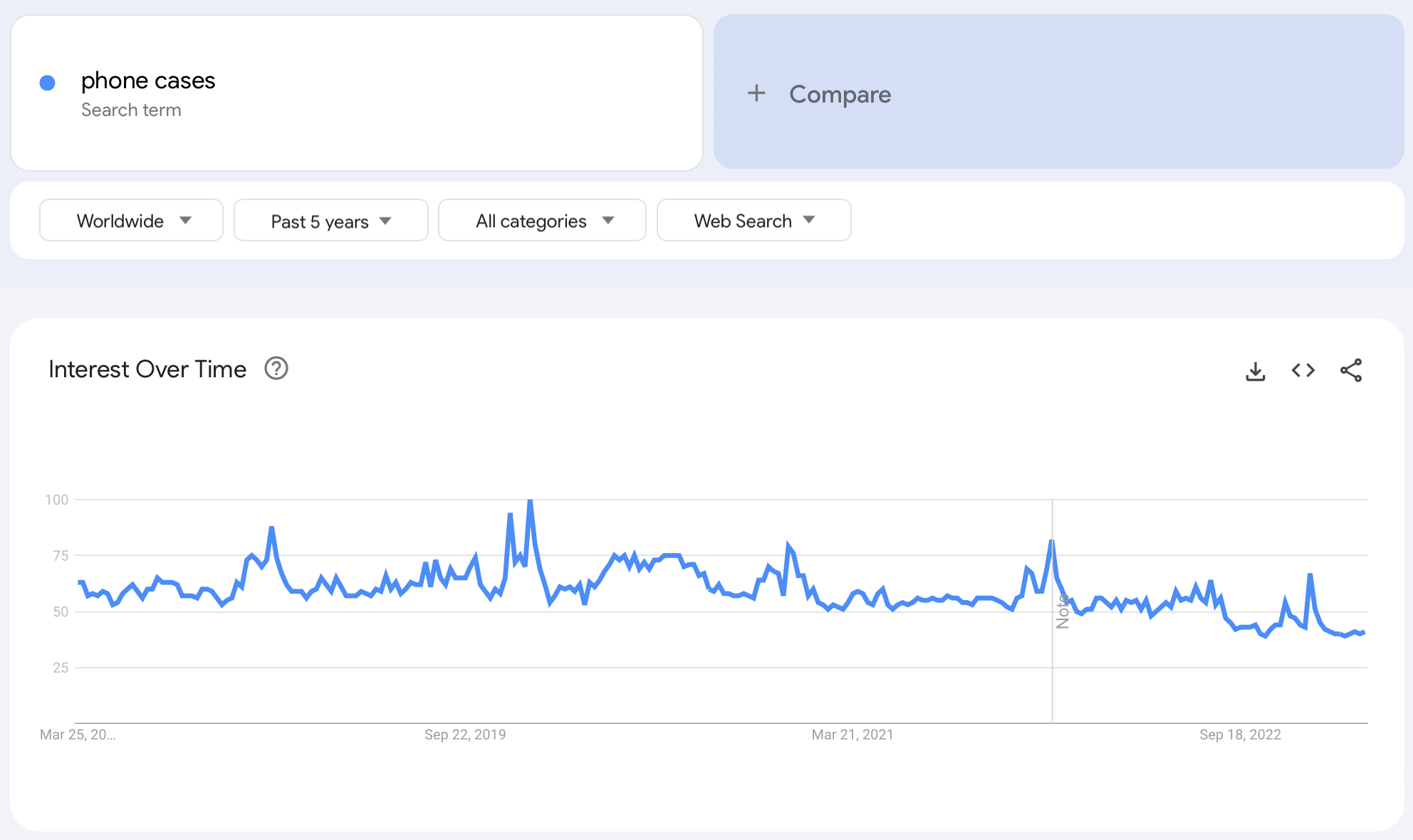 And Google Trends tells us that the popularity of the ‘phone cases’ search request is consistently high, but sometimes it’s just over the roof!