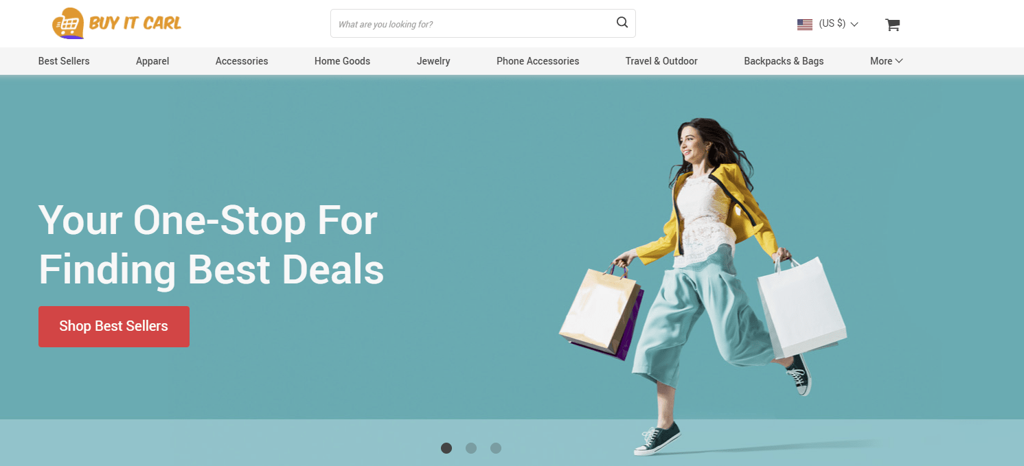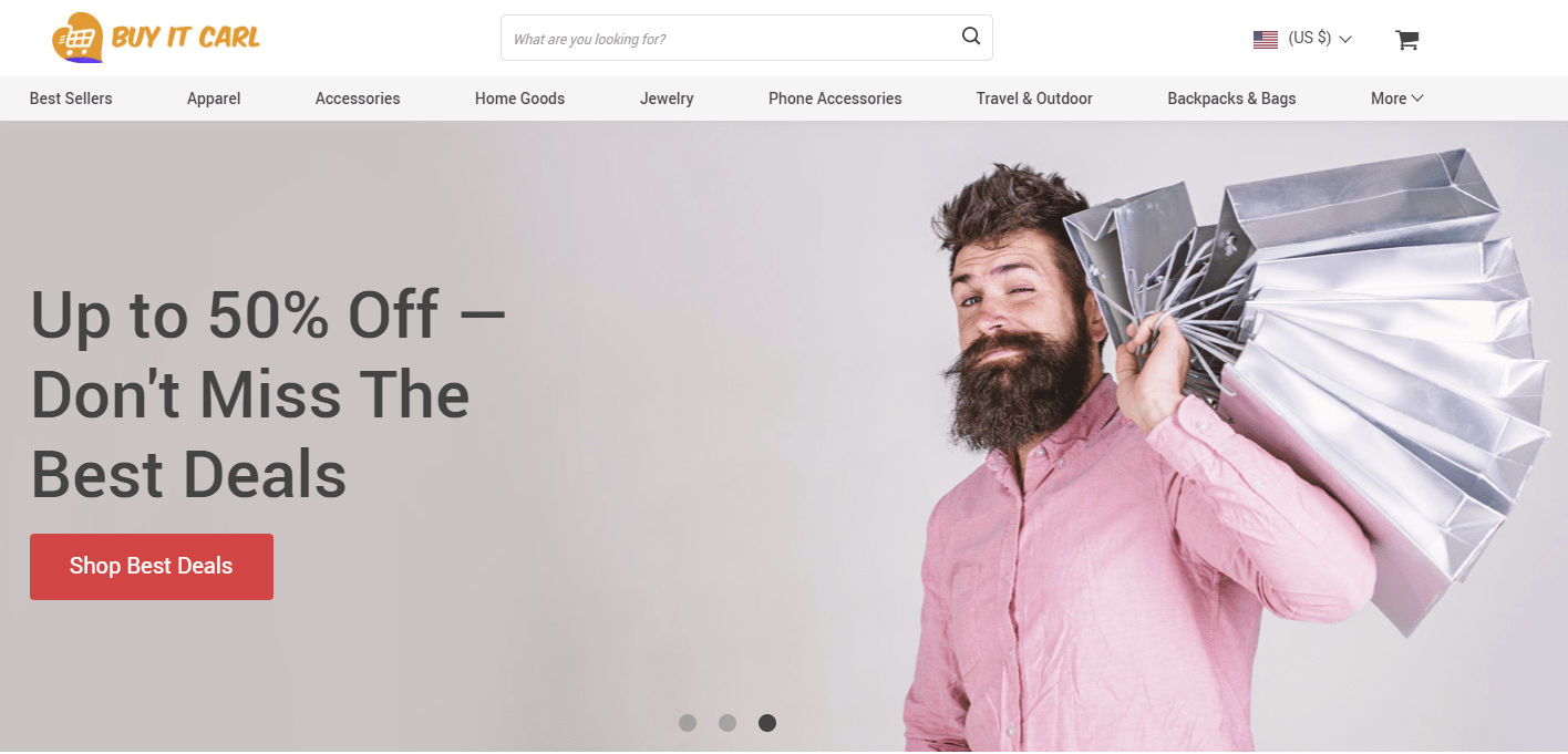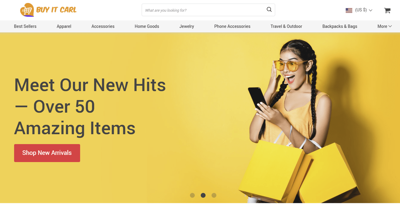 For our first successful dropshipping example, let’s take a look at our very own Buy It Carl. This is a general dropshipping store, meaning that it has a large product offering, not tied to a particular niche.