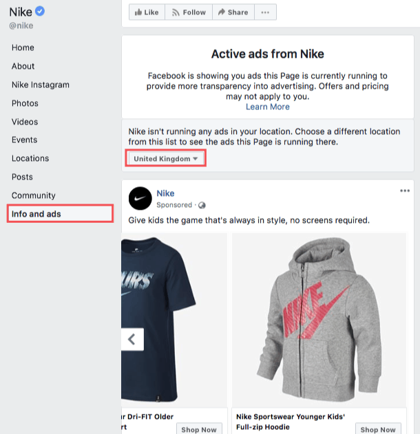 Let’s take Facebook as an example. In the left part of a company page, you can see the “Info and ads” tab. Click on it, choose the location and enjoy.