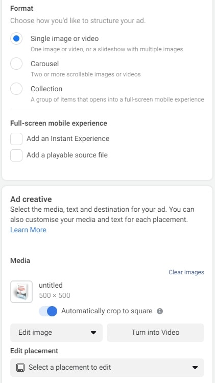 Additionally, in the Ad creative section, you can turn the ad into a slideshow (available for both images and videos) or into a video (if you use only a single image).