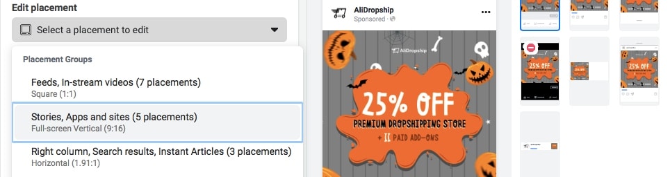 Facebook also lets you pick from a huge variety of sizes, with each suiting a particular placement type (i.e. where the ad will be shown). But our team recommends using the standard placement groups – square (1:1), vertical (9:16) and horizontal (1.91:1).