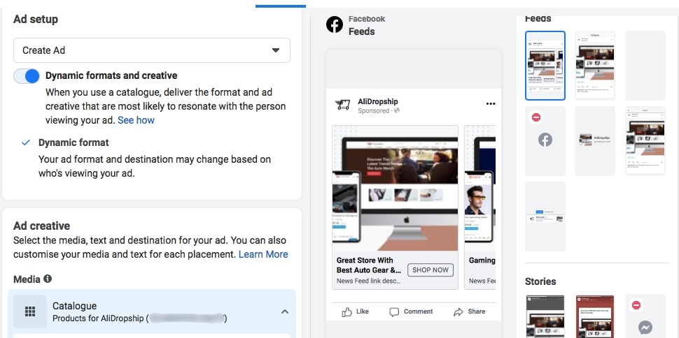 Certain ad types can be further modified into dynamic ads. Instead of making unique creatives, you choose a template. Then the ad automatically picks images or videos from your product catalog.