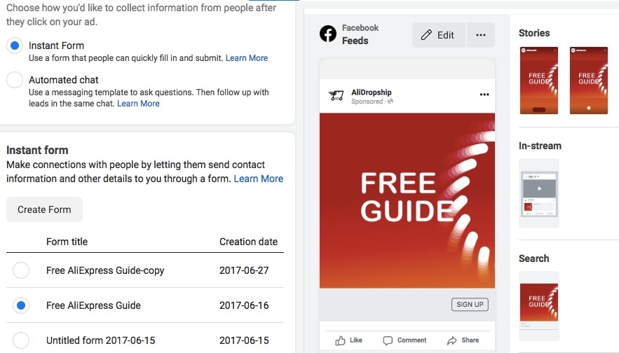 This type of Facebook ads is available for Lead Generation campaigns. It looks like standard image or video ads except for one thing. Instead of taking potential leads to your website, this ad lets users instantly fill in your subscription form without leaving Facebook.