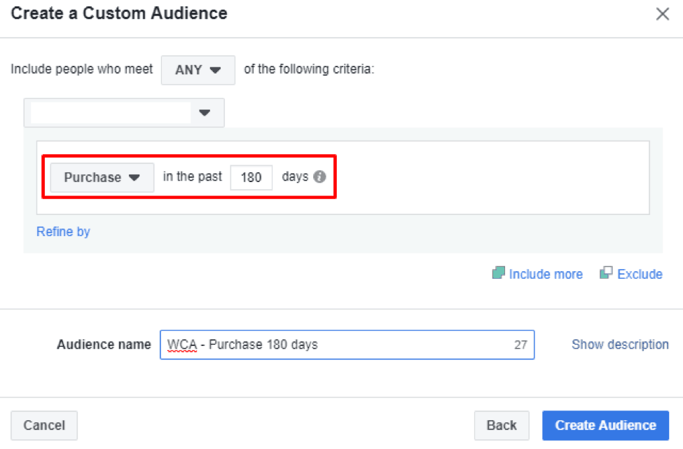 Name the audience in a way that will help you understand the included conditions. In our example, WCA means “Website Custom Audience”.