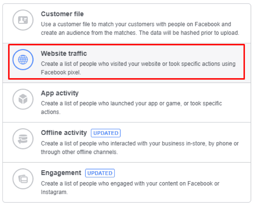 Choose «Website Traffic» in «Create a Custom Audience» window.