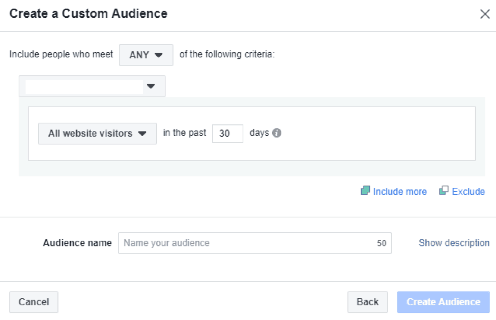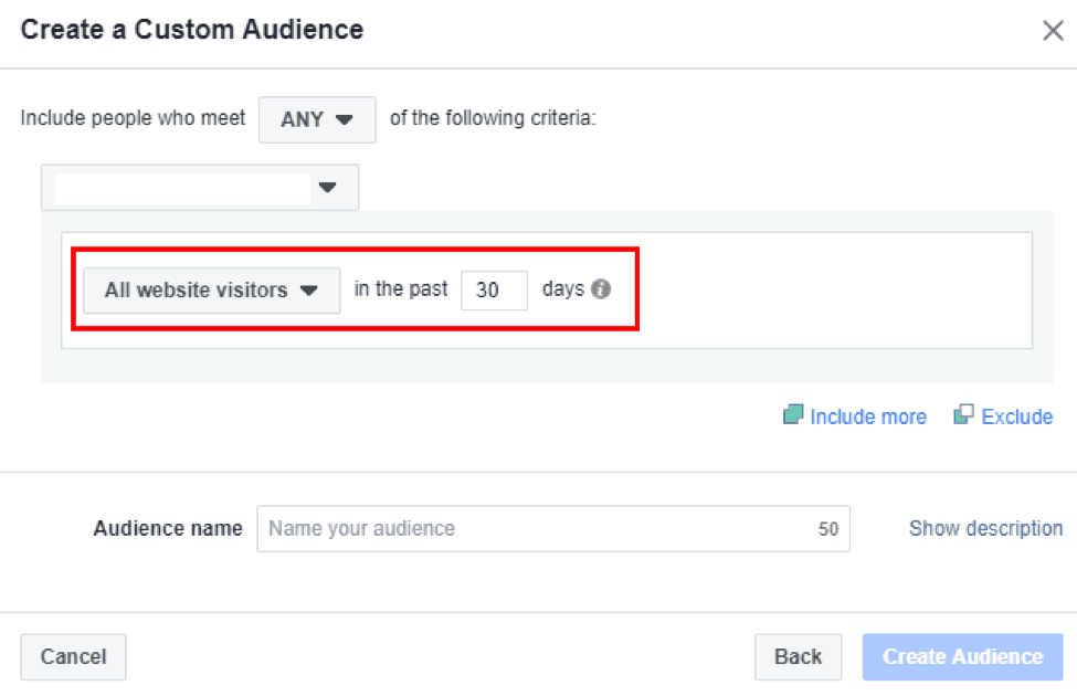 In our example, we have selected a 30 days period. A longer time period, for example 60 days, will create a wider audience, but a shorter interval is better for displaying advertisements. So, choosing a 30-day period, you will be showing advertisements only to the people who have been to your website during a 30-day period and not more. These visitors are “warmer”, and are more likely to remember about your store than those that visited your site 60 days ago.