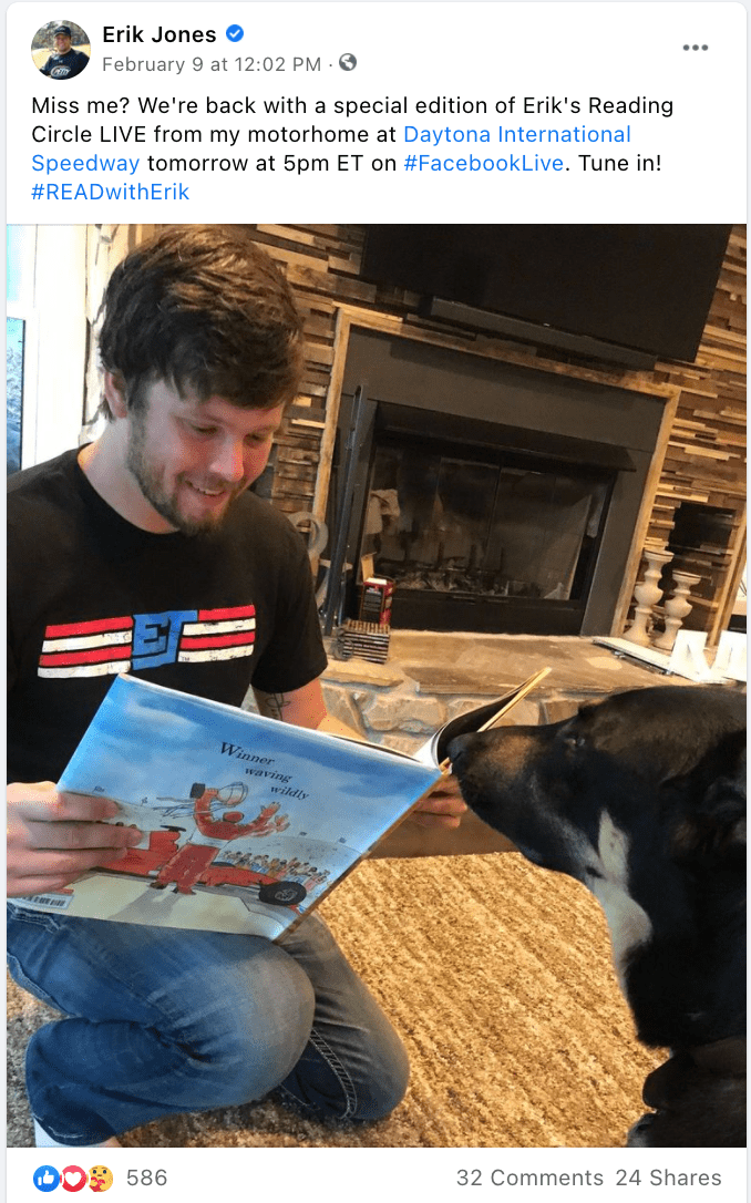 A key component to why influencers (and YouTubers) are even successful, is the ability to relate to an audience. And that relatability manifests itself in the form of being able to share an experience — and video is usually the greatest medium for this. With Facebook influencers, you can use Facebook Live or Facebook Video to have a talent speak of their fitness journey or wellness battle, for instance, if it relates to your brand or products. We see here, for example, Nascar driver Erik Jones sharing a Facebook Live session for a book-reading session.