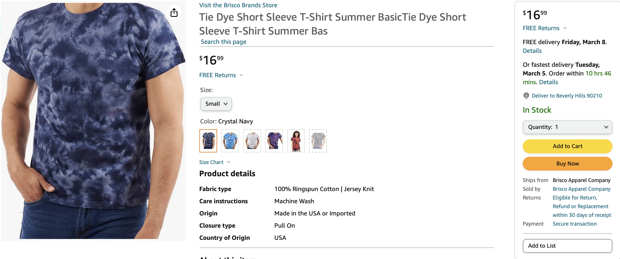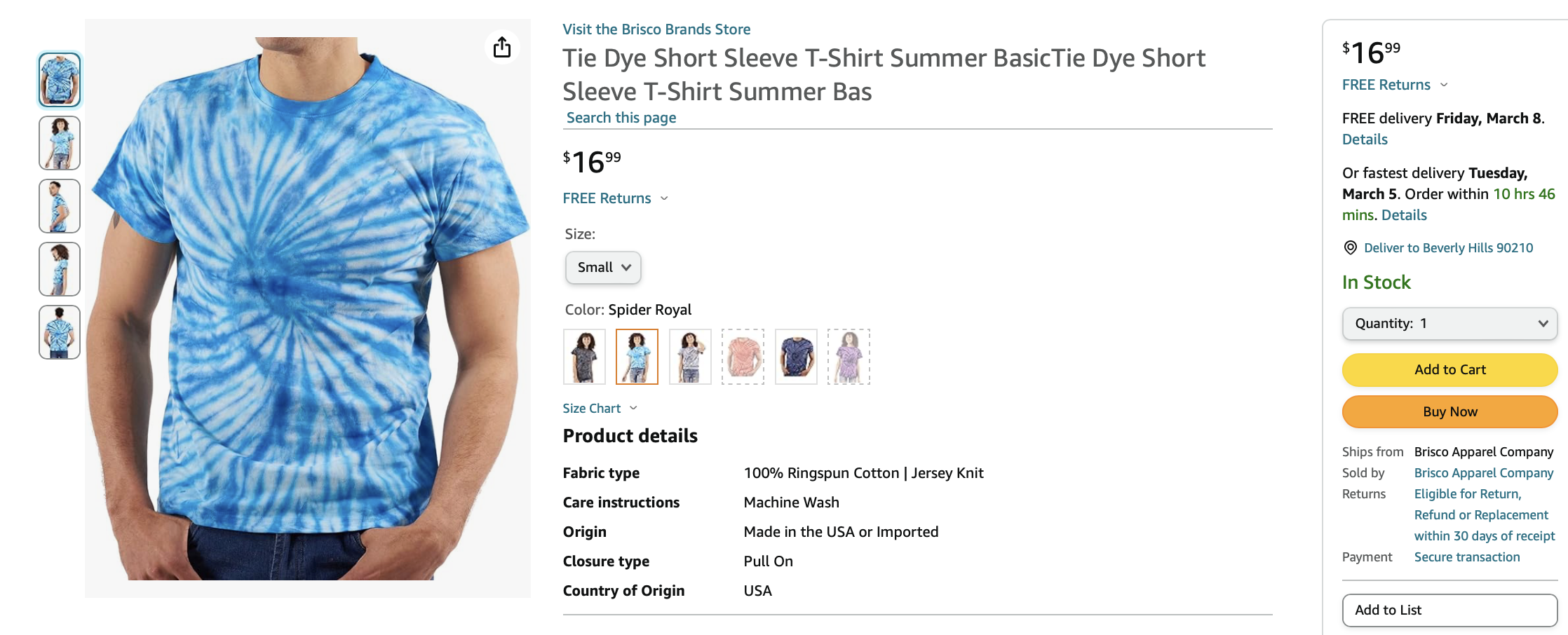 Consider one of their popular items – a tie-dye t-shirt priced at $16.99.