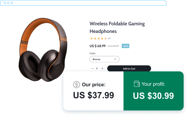 Import products from our catalog, set up the profit margins, sell products in your store, re-order them from AliDropship at the lowest price and keep the profits.