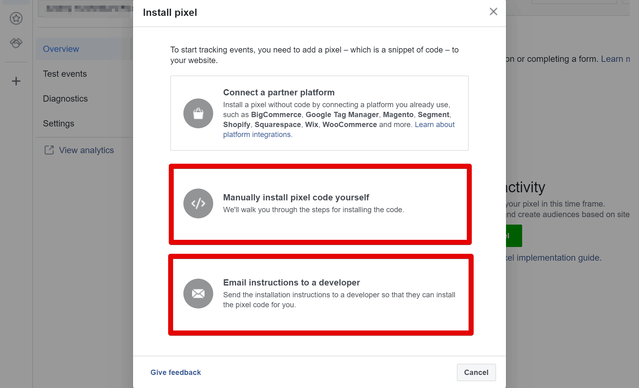 Keep it in mind that you’ll need to be able to make changes in your website’s code for installing the pixel manually. If you can’t do this, you’ll have to send an e-mail with the instructions to your site’s developer so that they do this for you.