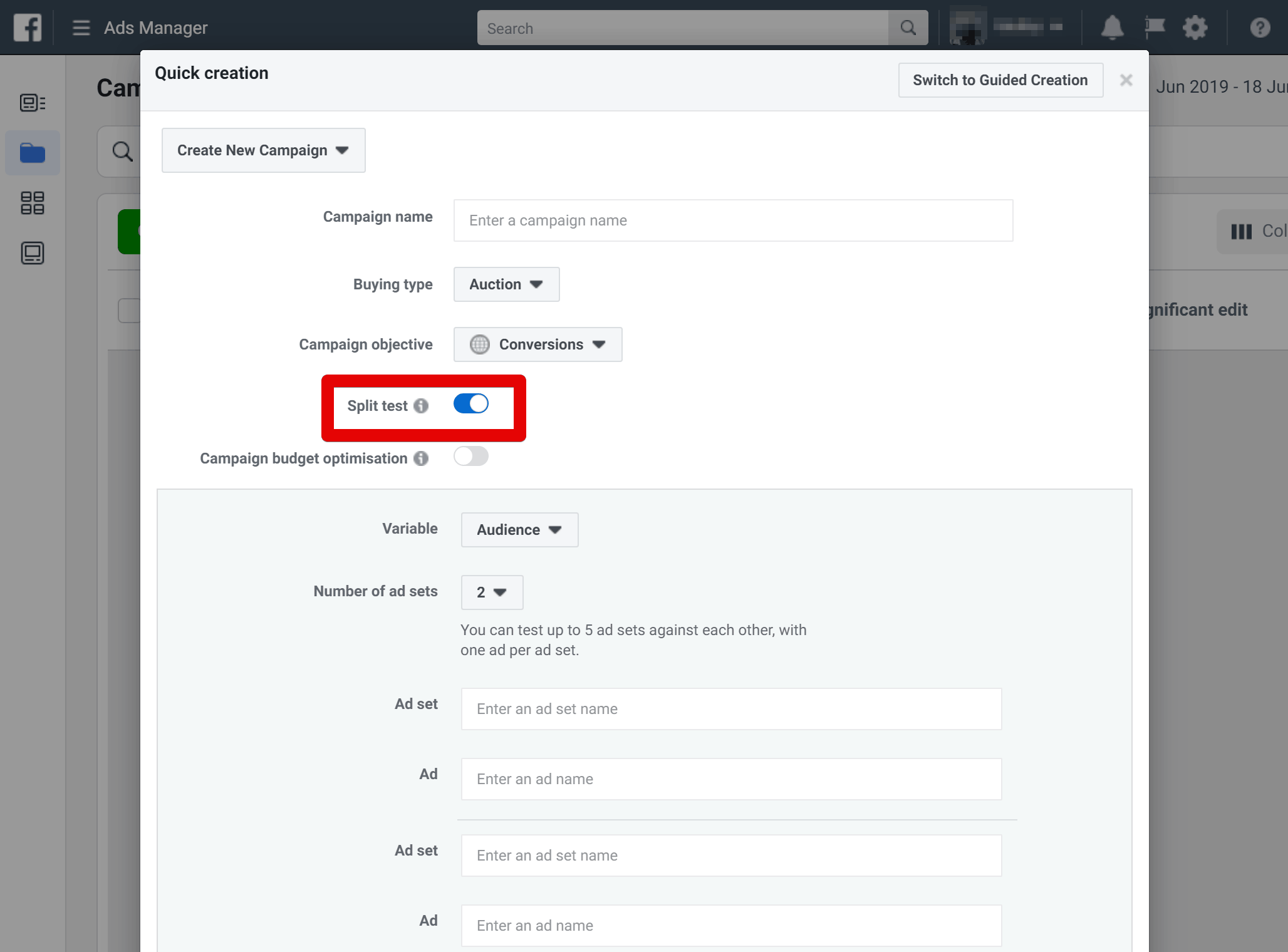 To launch a split test, you need to enable “Split test” at the very beginning of creating your ad as it’s shown in the picture below.