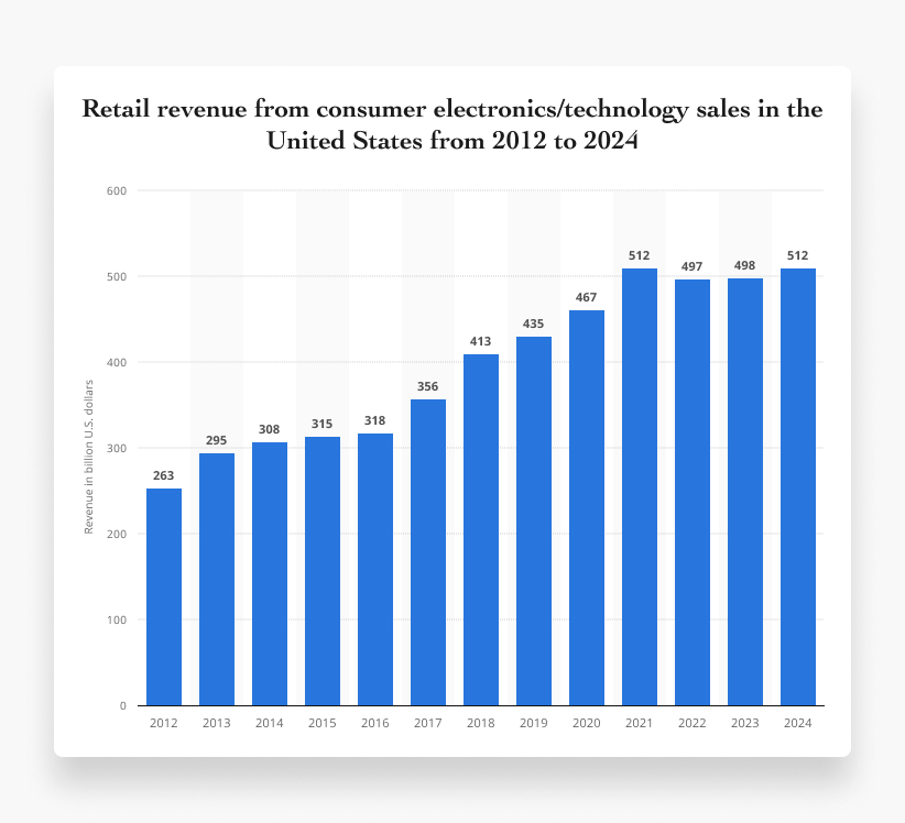 According to Google Trends, interest in advanced technology products has remained steady over the past five years. Furthermore, a report from Statista forecasts that the consumer electronics market will reach $512 billion by 2024.
