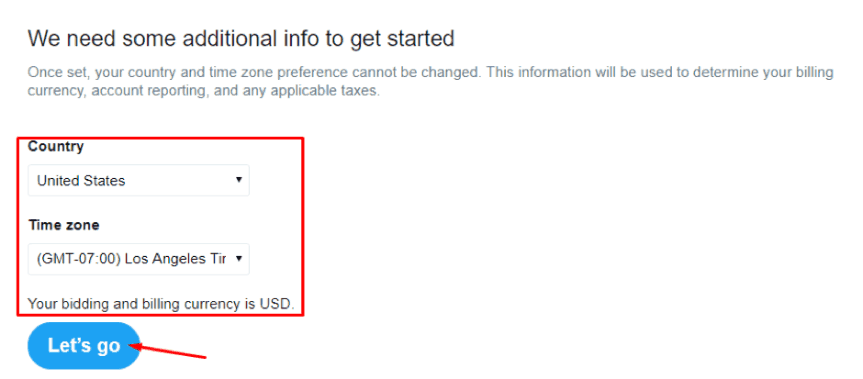 You will be redirected to ads.twitter.com, where you’ll need to enter your country and time zone.
