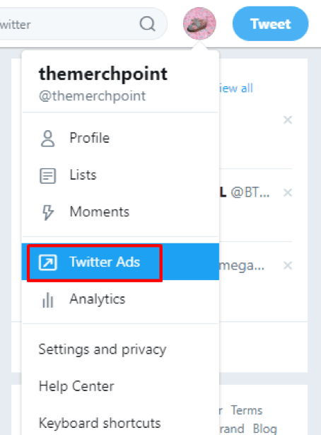 To do this, go to your profile and click on your profile photo. Choose the Twitter Ads button.