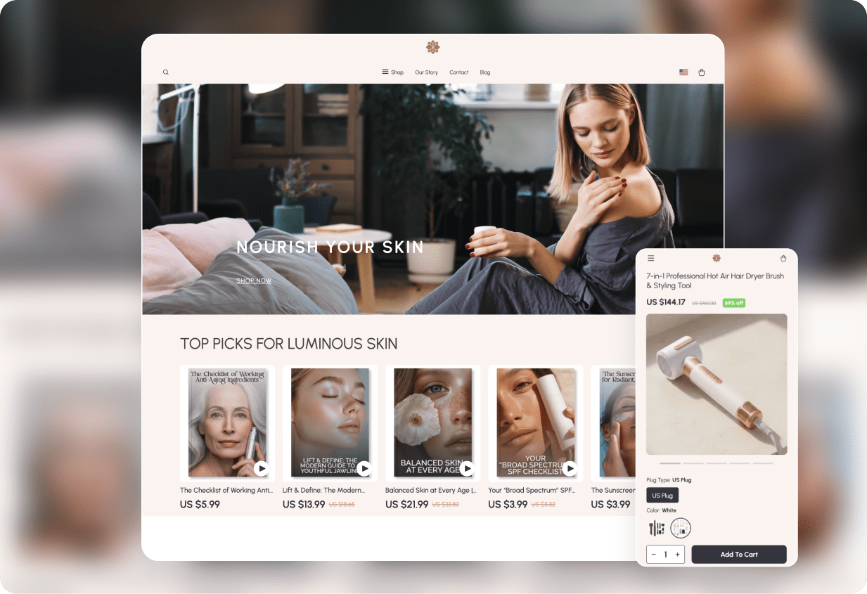 - You get an instant link to your ready-to-sell TikTok & Instagram store, complete with one-click checkout and your top social-media-friendly products already showcased.