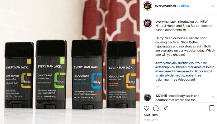 Every Man Jack uses a group of hashtags to mention its brand, a campaign concept, and ingredients of its deodorant.