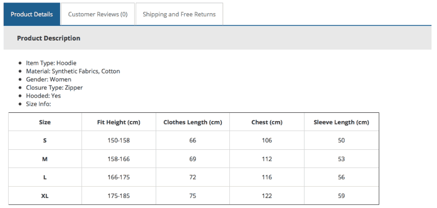 Every product description should contain (at least!) a true-to-fact size chart, the materials’ guide, and washing instructions. The more details you can give, the better!