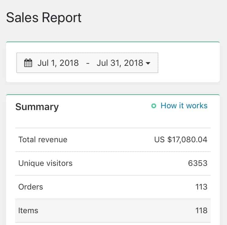 I am currently running one store and I am working on another store. In the month of July 2018 I hit a total sales of US $17,080.04 as per attached screenshot.