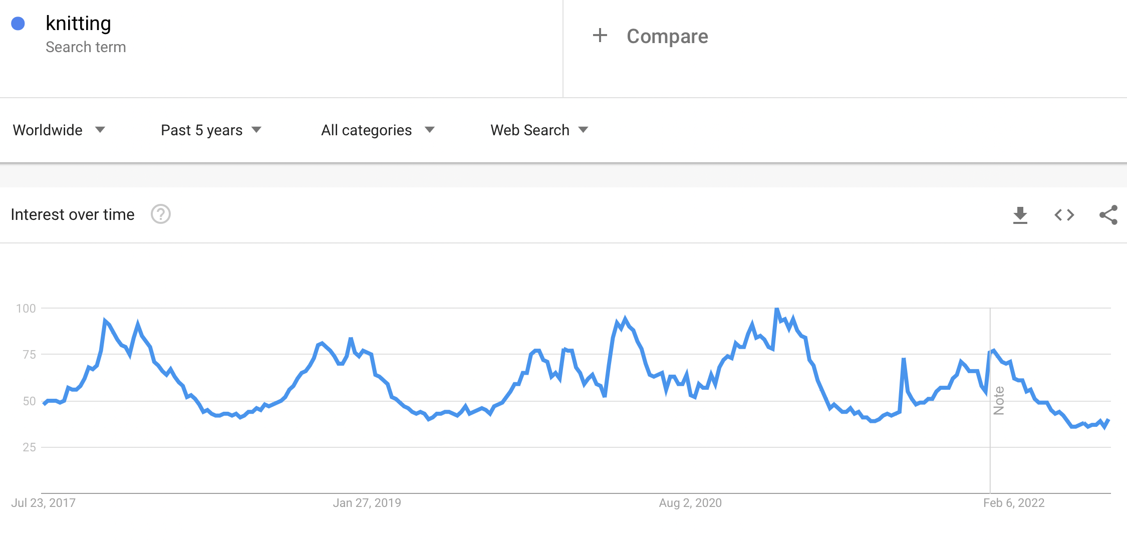 2. Go to Google Trends and type in this category in the ‘Explore Topics’ field. Let’s take ‘knitting’, for example.