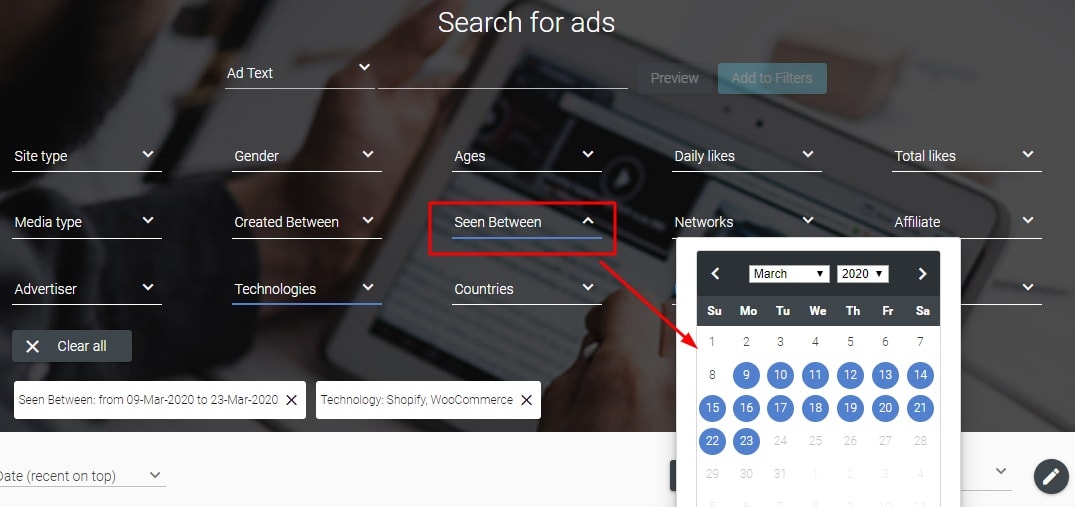 Then you’re supposed to see the most popular ads on Facebook for a particular period of time in terms of the number of ‘likes’. The list of ads shown is going to be extremely long. So be ready to scroll down for too long since the biggest part of the products from ads is highly unlikely to suit your store.