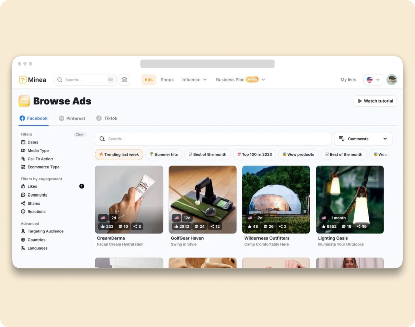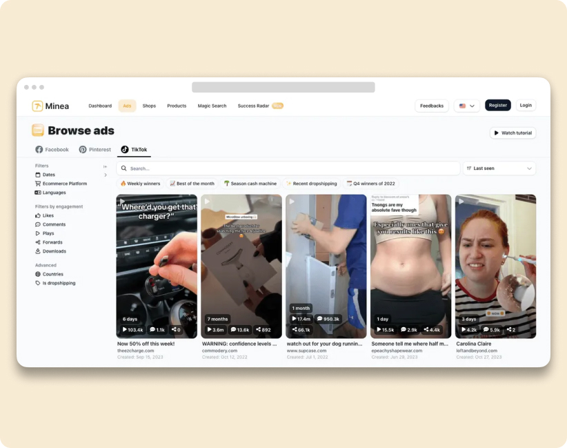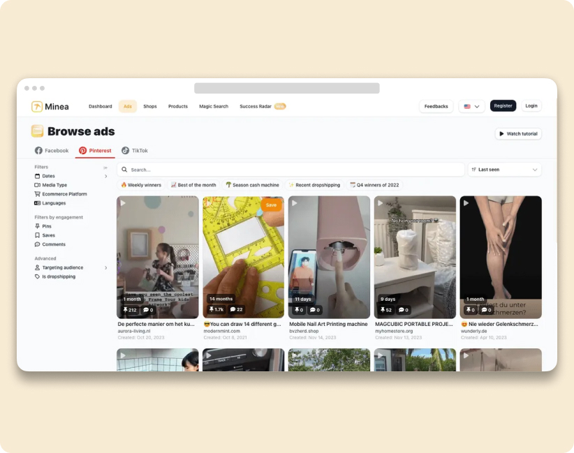- Minea: this tool provides detailed information on market trends and what competitors are doing, showing you which products are being heavily promoted and how they are being presented to customers.