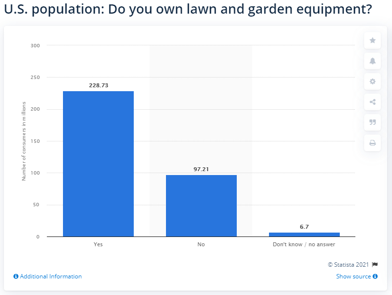 To a great extent, this trend resulted from the COVID-19 breakout which made Americans focus on their homes. On the other hand, according to Statista, 228.73 million Americans owned lawn and garden equipment in 2020, not to mention every family decorates their homes.