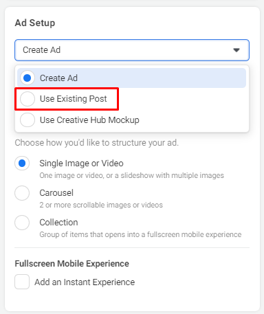 So, to promote the post you sponsored, feel free to just go to the Ads manager, create an ad as usual, choose the “Use Existing Post” option. And voila! – the sponsored post will be suggested among your usual posts available for promotion.