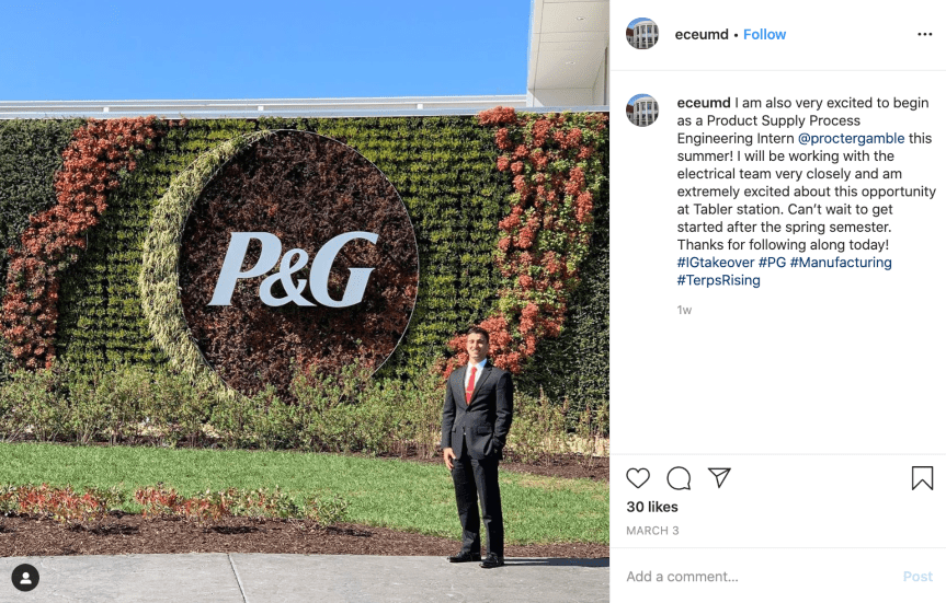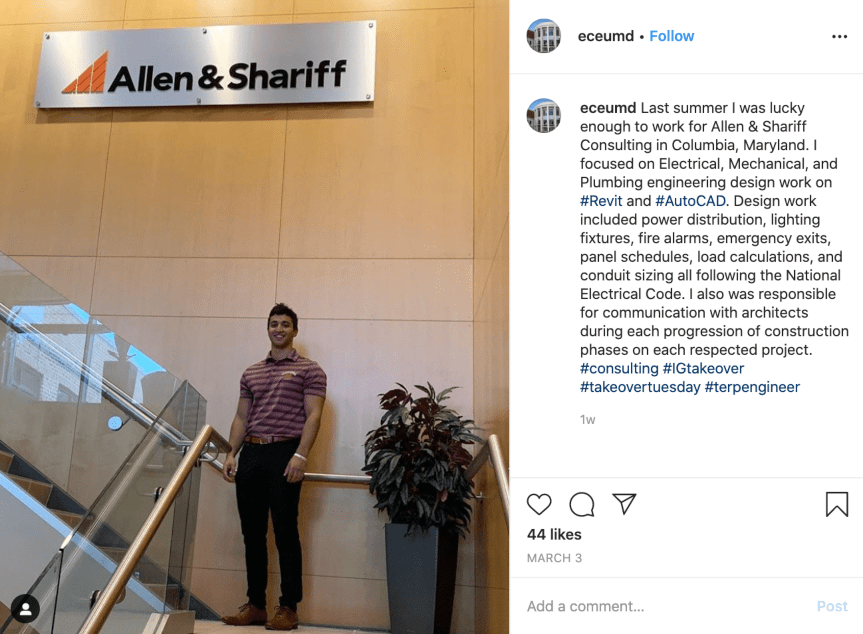 The University of Maryland Instagram account regularly has takeovers done by students to share their experience. This allows the department to make a personal connection to viewers and those who are enrolled at the university or in the same department major. The takeover shines a spotlight on a fellow outstanding student while bolstering the department’s account as one that is informative and inspiring.