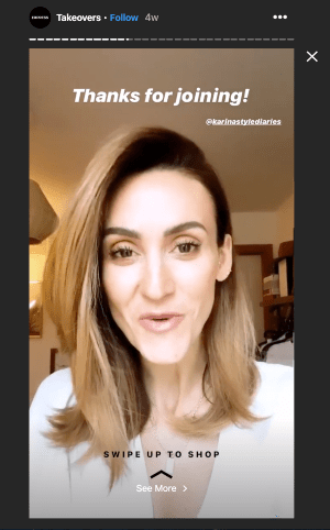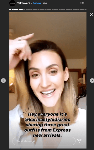 Above, we can see Karina Reske, a style blogger and influencer whom Express partnered with for an Instagram Story takeover. Since Express sells both women’s and men’s clothing, it makes sense to work with a fashion influencer to reach a target audience — in this case, a female personality to drive traffic to shop women’s clothes. Reske shows outfits she picked to connect to Express’ audience of shoppers. Her takeover story will also bring her own followers to connect with the Express brand. Reske finishes off her looks with a swipe-up link that leads to a landing page for Story viewers to shop.