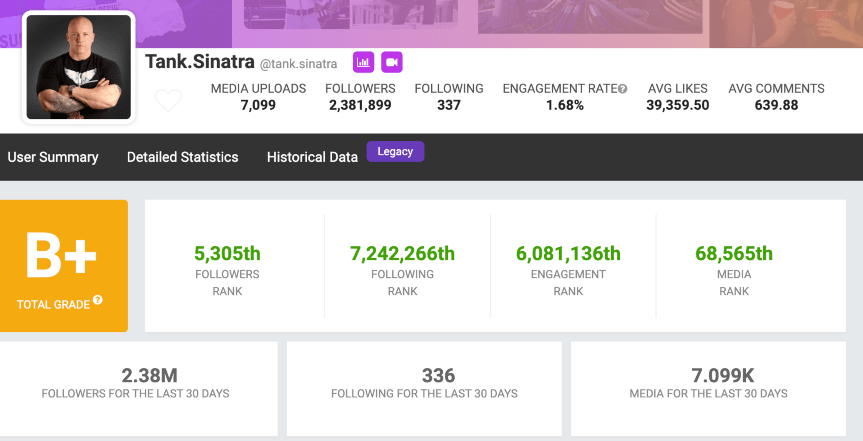 SocialBlade screen that shows engagement rate for tank.sinatra, a popular meme account.