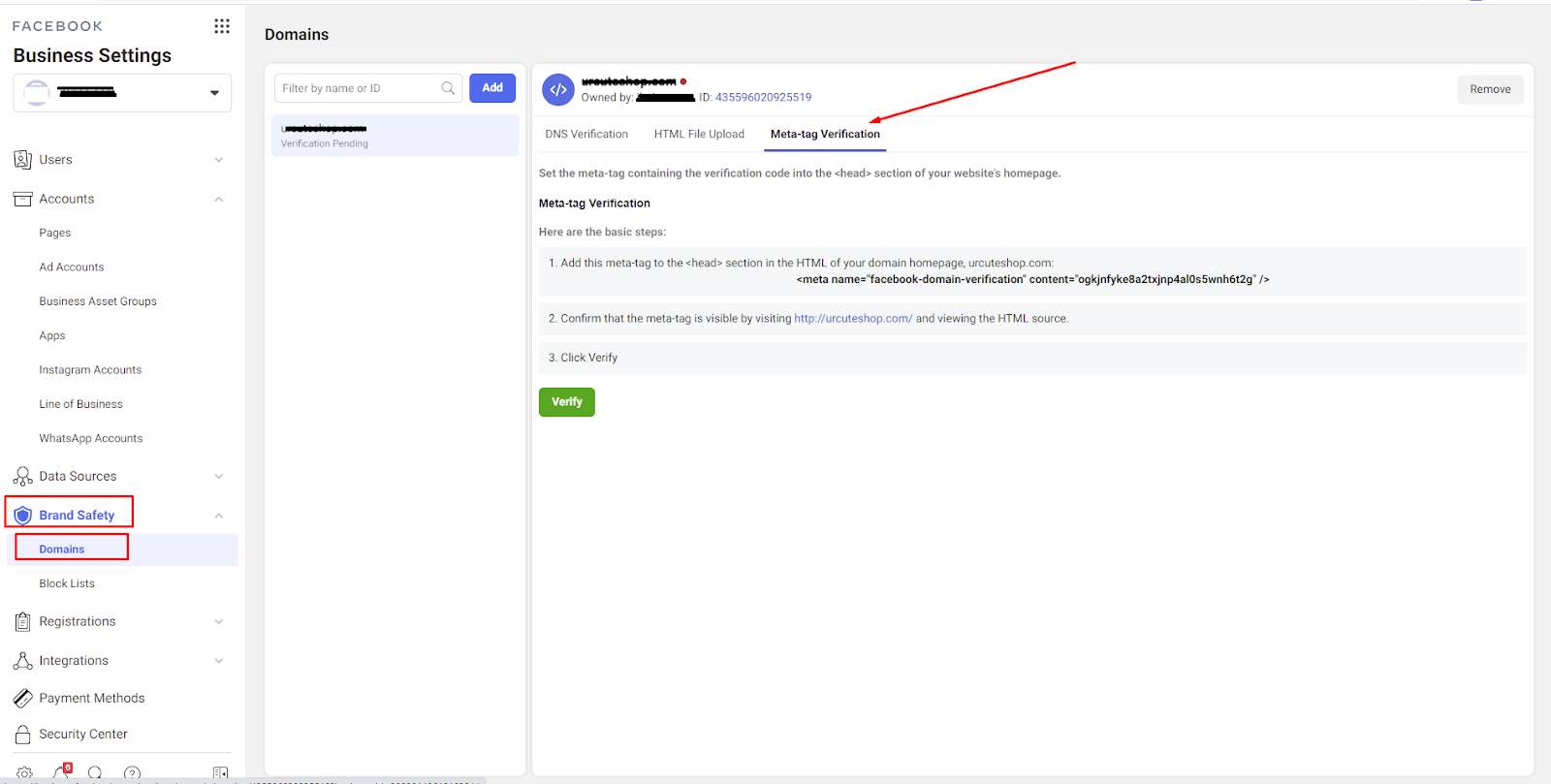 Go to your Facebook Business settings > Brand Safety > Domains. Add your store’s domain name there and verify it by one of the three methods.