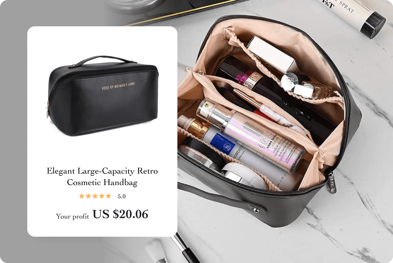 Upgrade your catalog with this retro cosmetic handbag today and enhance your customers’ beauty routines effortlessly.