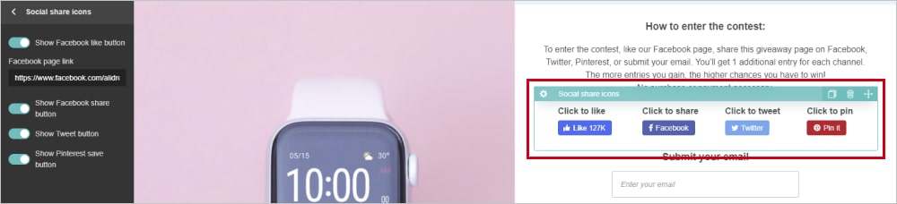 Once potential participants are familiar with ‘what’, it’s time to get down to the ‘how’ part. Explain how to enter the contest and how points are scored. The Landing Pages add-on provides four social buttons to fulfill the task: