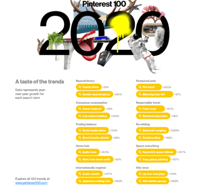 Pinterest is all about what’s hot and trendy and getting people’s attention (and pins). In the company’s Q4 report for shareholders in 2019, the scrapbook-inspired platform released 100 trends it foresaw for 2020. You can see from the above screenshot that pets, beauty, the great outdoors, art, and fashion are some highlights — and you find ways to formulate your brand voice or style guide or design to maybe skew towards any of these, especially if your business is centered on some of these niches.