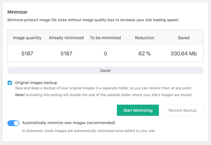 What is more, Minimizer has an option of an automatic minimizing new images. That’s why it’s not necessary to manually optimize each and every image uploaded to your website.