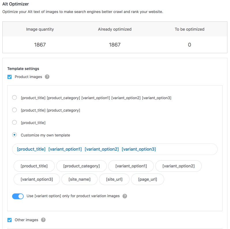 You may create individual alt texts for each of your products, or use our Alt Optimizer! This tool is going to add already optimized Alt tags to your images. You just need to choose one of the pre-made templates.