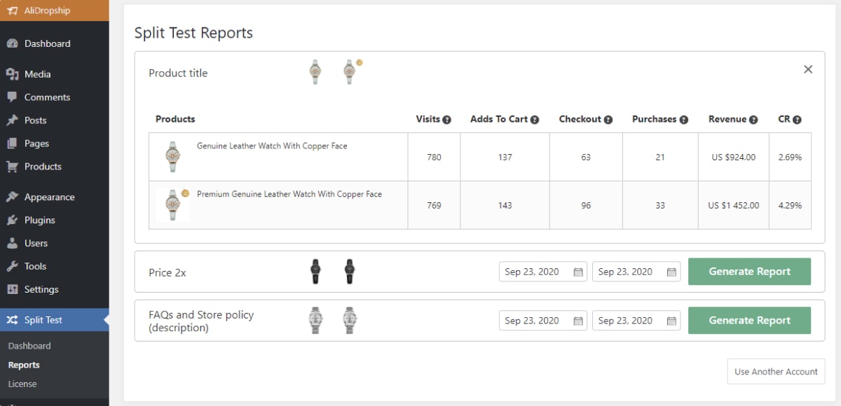 The Split Test add-on processes data collected from Google Analytics and shows only those metrics that really matter to an ecommerce store. You won’t have to deal with heaps of information in your GA account – you can find valuable product insights right in the Report tab of the add-on.
