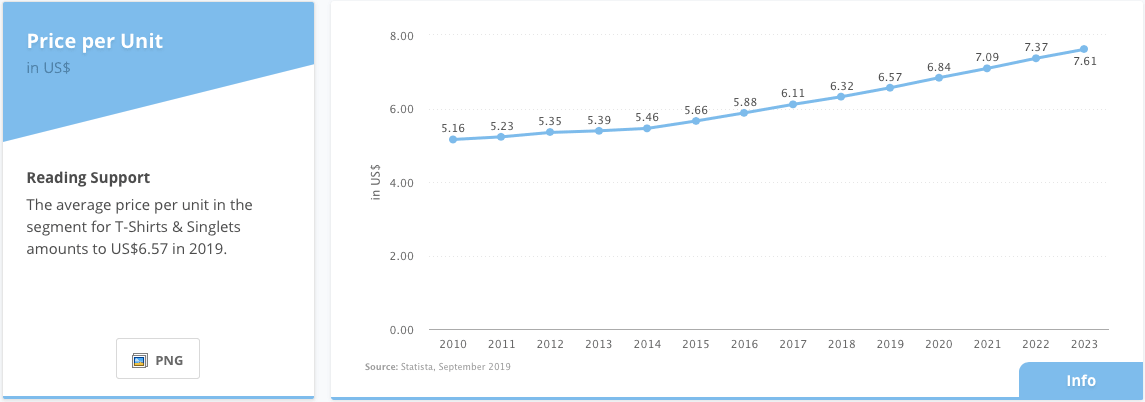 According to Statista, the average t-shirt/singlet price in 2019 is $6.57.