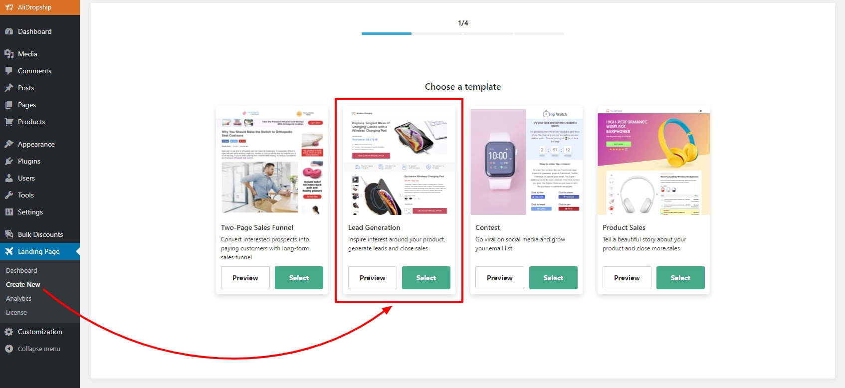 After installing the Landing Pages add-on, enter the admin panel of your dropshipping store, click on the “Landing Page” and “Create New”. After that, select the Lead Generation template. One can also use Landing Pages with our Bulk Discounts add-on and combine the features of these solutions.