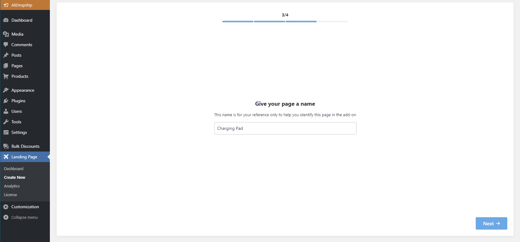 Then give a name to your newly created page. This name will be displayed only in the admin panel to make finding the page easier for you.