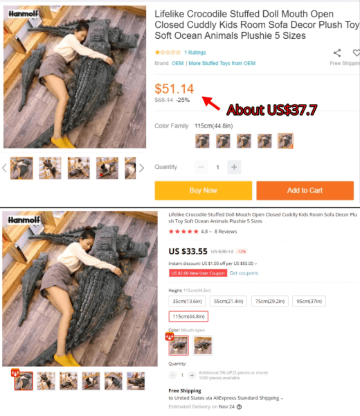 As you can see, these are two totally identical plush toys. But let’s look at the price. The toy on Lazada costs about US$37.7 while its price on AliExpress is US$33.55. The original price on the screenshot is in Singapore dollars. If we forget about the claimed discounts, the prices will be US$50.2 and US$38.12 respectively.