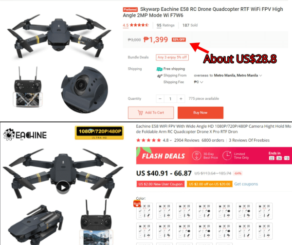 As you can see, these are identical drones (probably made by the same manufacturer). Still, its price on Shopee is lower than on AliExpress. In addition, you can find lots of local brands on Shopee that don’t sell their goods on AliExpress.