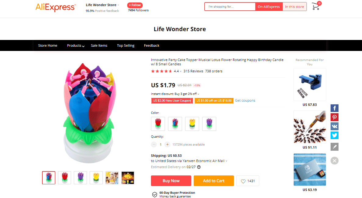 AliExpress find: price – $1.79, rating – 4.4*, number of orders – 738