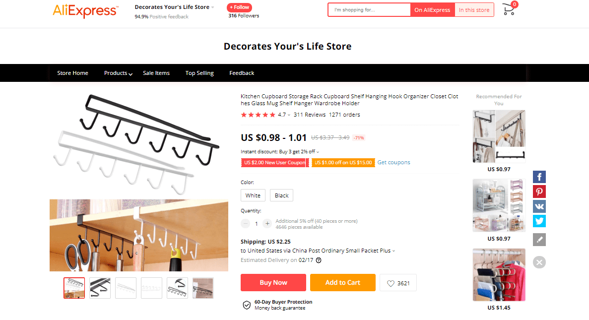 AliExpress find: price – $0.98-1.01, rating – 4.7*, number of orders – 1271